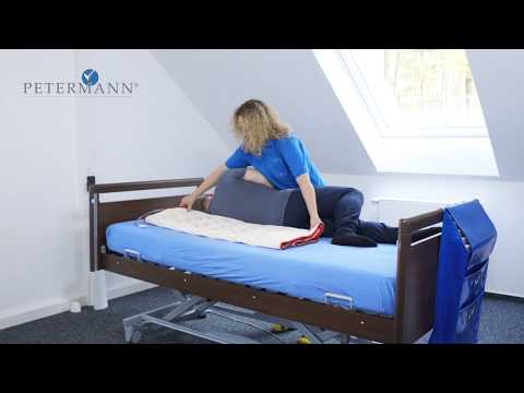 Die verdeckten Griffe und Zugschlaufen des Drehlakens ermöglichen der Pflegeperson den Pflegebedürftigen im Bett frei und schonend in die angestrebte Pflegesituation zu bewegen.